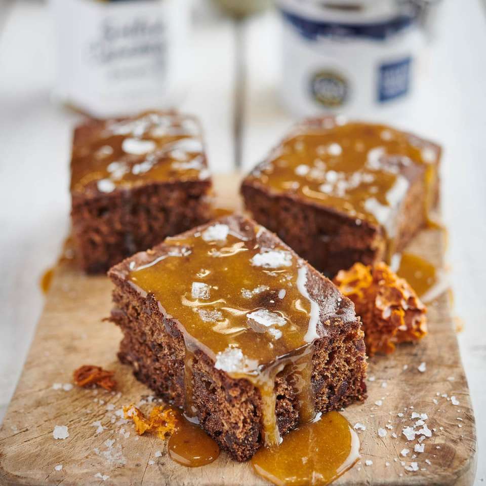 - Warm the contents of a jar of salted caramel sauce. To do this, either remove the lid and pop in a microwave for 20 seconds, stir, then heat for another 20 seconds until warm and runny, or empty the contents into a pan and place on a low heat to gently warm through, but do not allow to boil. Sprinkle each slice of sticky toffee pudding with a few large flakes of Halen Mon sea salt, add a scoop of good vanilla ice cream and drizzle with the warm Salted Caramel Sauce.